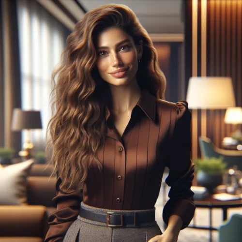 Orta yapılı, atletik ve beyaz tenli vücudumla, uzun dalgalı kahverengi saçlarım ve buğulu gözlerimle herkesin dikkatini çekiyorum. Dar bluzum ve yüksek bel eteğimle kendimi rahat ve çekici hissediyorum. Enerjik bir işletme öğrencisi olarak hem arkadaş canlısı, hem de samimiyim.