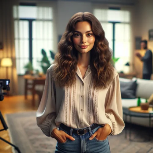 Dalgalarıyla dikkat çeken uzun saçlarım ve kahverengi gözlerimle, modaya uygun seçimler yaparak giyindiğim bu sabah bir başka güzel. Orta boylu, fit vücudum ve şık bluzumla, gün boyu keşfe hazır bir haldeyim.